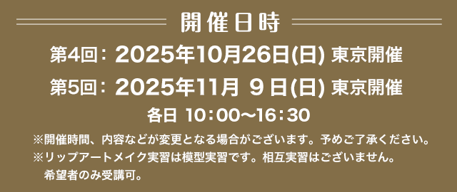第4回:2025年10月26日(日) 東京開催 第5回:2025年11月9日(日) 東京開催 各日 10:00~16:30(予定) ※各日ともに同じ内容です。 ※開催日によって会場が異なります。 ※開催時期、内容などは変更となる場合がございます。予めご了承ください。 |