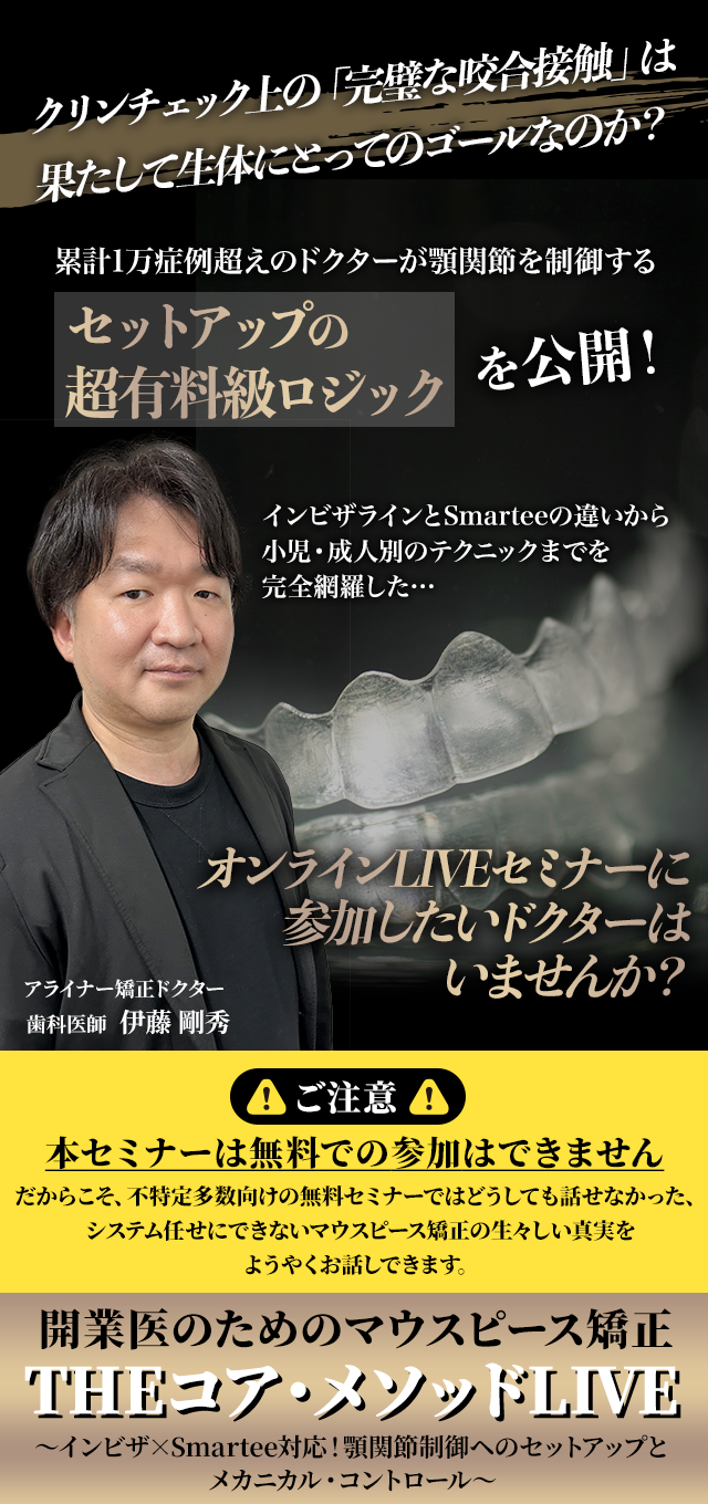 マウスピース矯正を手掛ける全てのドクターにとって「顎関節への影響と防衛」は、絶対に避けては通れない共通の壁なのです。