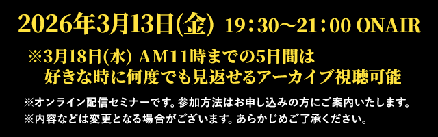 | 開催日時 | 2026年3月13日(金) 19:30~21:00 ※オンライン配信セミナーです。参加方法はお申し込みの方にご案内いたします。 ※3月18日(水) AM11時までの5日間は 好きな時に何度でも見返せるアーカイブ視聴可能 ※開催時期、内容などは変更となる場合がございます。あらかじめご了承ください。 |