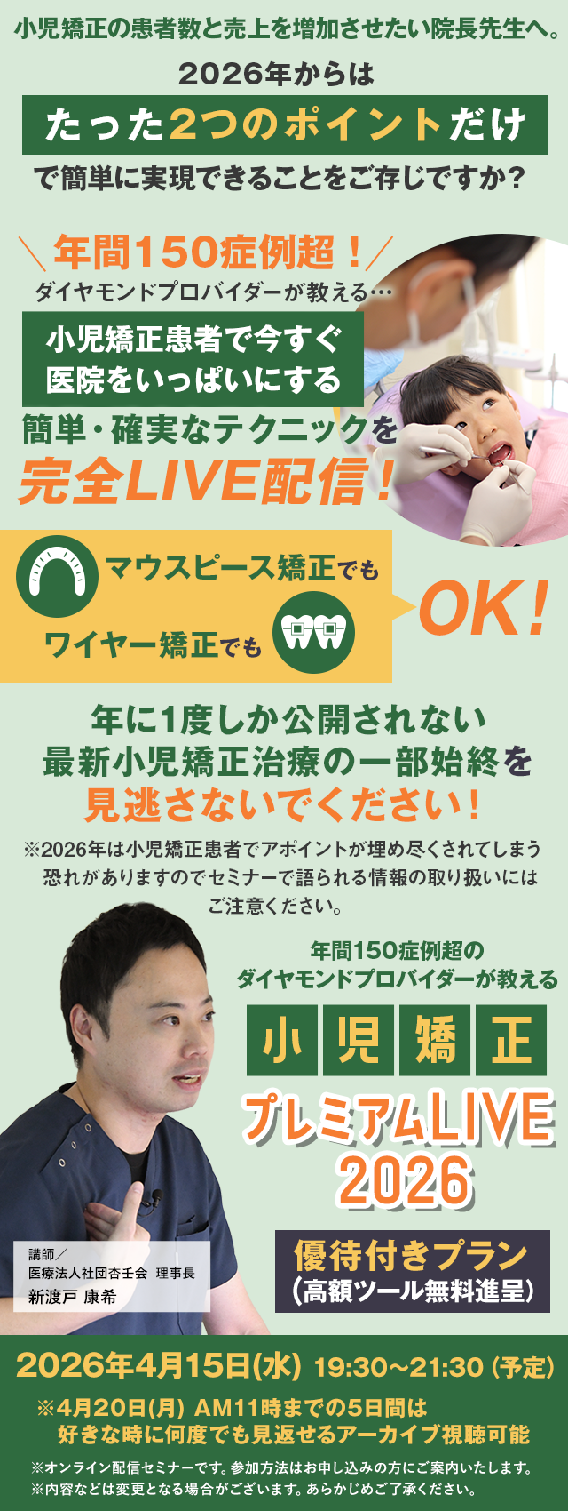 | セミナー名 | 年間150症例超のダイヤモンドプロバイダーが教える 小児矯正プレミアムLIVE2026:優待付きプラン(高額ツール無料進呈) |