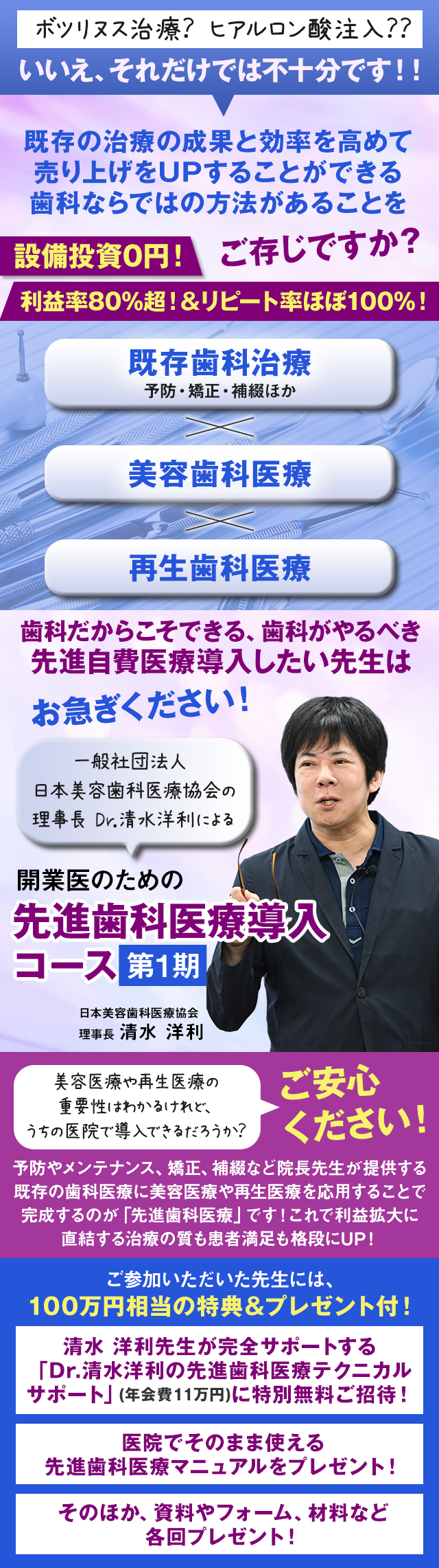 参加特典 ・清水 洋利先生が完全サポートする「Dr.清水洋利の先進歯科医療テクニカルサポート」(年会費11万円)に特別無料ご招待