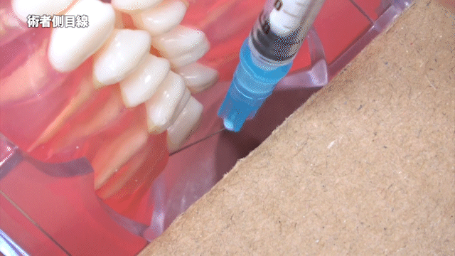 神経は後方から前方へ走行しているため、まずは後ろ側から順に注入し、さらに神経が歯根から歯冠方向に向かうため、下方から上方へアプローチしていきます。