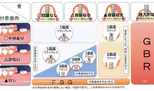 付着歯肉が確保できる場合は1回法で、付着歯肉がない場合は2回法になりますがメスの入れ方(舌側寄りに切開線を引いてあげる)でも付着歯肉を温存することも可能です。