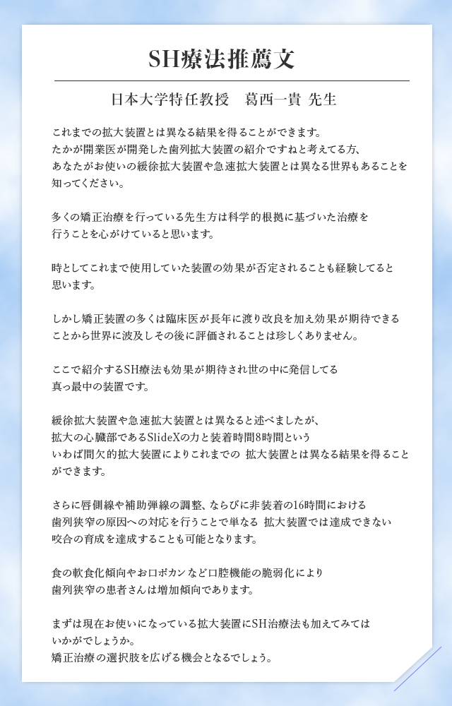 SH療法は星岡先生だけでなく多くの著名な先生方が学術顧問として参加しており、これから世界に波及していく矯正治療の重要な選択肢です。