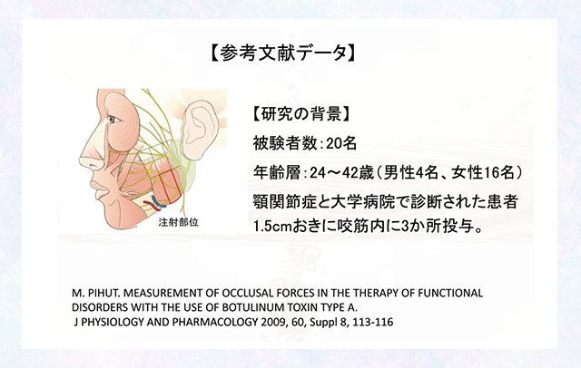 海外では2000年前半頃から様々な論文が出始めており、補綴歯科学会でもボツリヌス治療の有効性を国際セッションされていたり、日本顎関節学会でも報告されています。