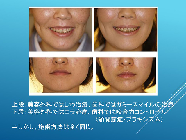 美容外科ではしわ治療の部位は歯科ではガミースマイルの治療目的。美容外科ではエラ治療の部位は歯科では咬合力コントロール目的で注入します。