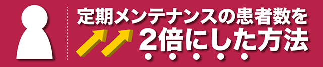 と、この2つをするだけで、院長先生は定期メンテナンスの患者数をUPすることができ、 月の終わりには翌月の予約が埋まっている安心感を持った経営が可能となるのです!