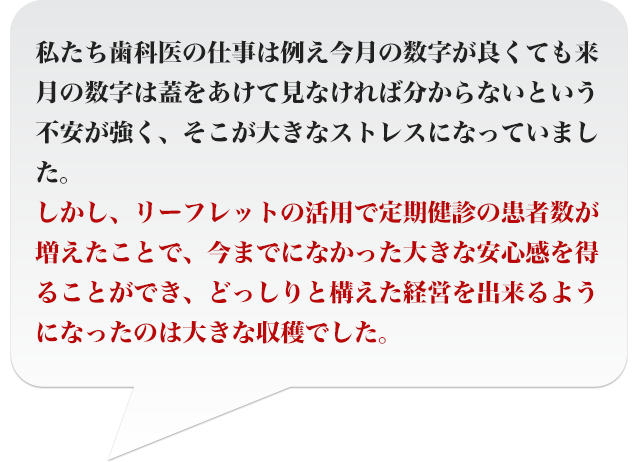 このように『定期メンテナンスを行う理由づけ』をしっかりと患者様に行えるというのが山田式リーフレットの最大のメリットなのです。