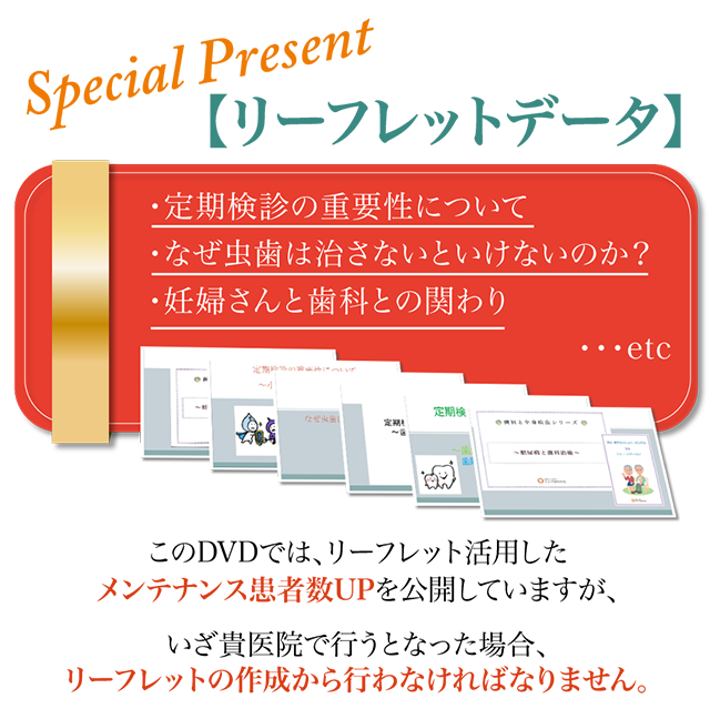 山田先生が定期メンテナンス患者を2倍にUPさせたノウハウだけでなく、リーフレットデータもセットになっていますので、正直値段は非常に悩みました。