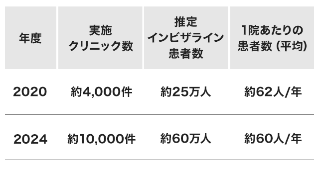 実際にインビザラインは2020年時に4,000件程度のクリニックが行っていましたが、2024年には10,000件を超えています。
