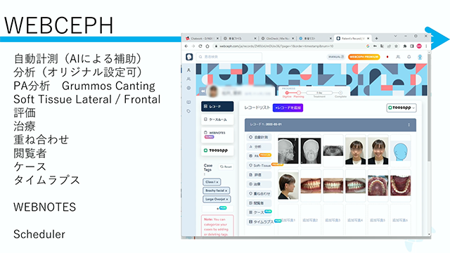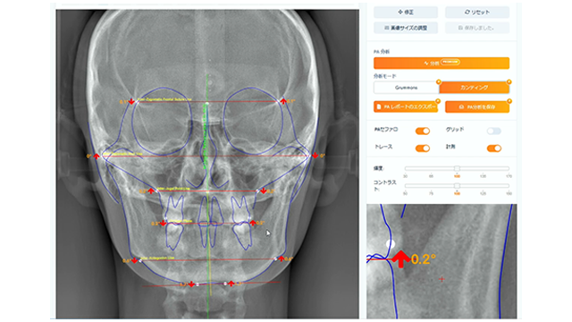WEBCEPHを使えばワンクリックでセファログラムの自動トレースや分析を行い、治療シミュレーションや患者情報管理など多機能なサポートを提供しており、診断やカウンセリングの精度向上と時間短縮ができると評価されています。