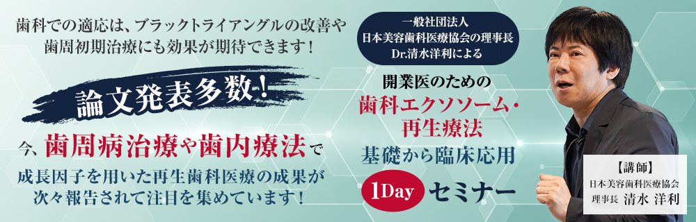一般社団法人 日本美容歯科医療協会の理事長 Dr.清水 洋利による 開業医のための歯科エクソソーム・再生療法の基礎から臨床応用1Dayセミナー