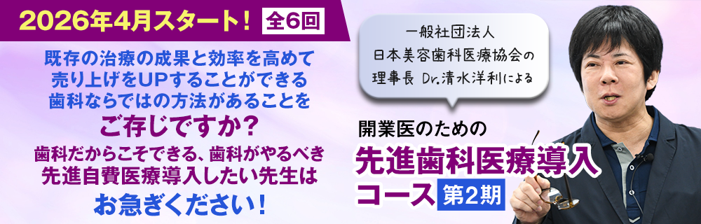 一般社団法人 日本美容歯科医療協会の理事長 Dr.清水 洋利による 『開業医のための先進歯科医療導入コース』